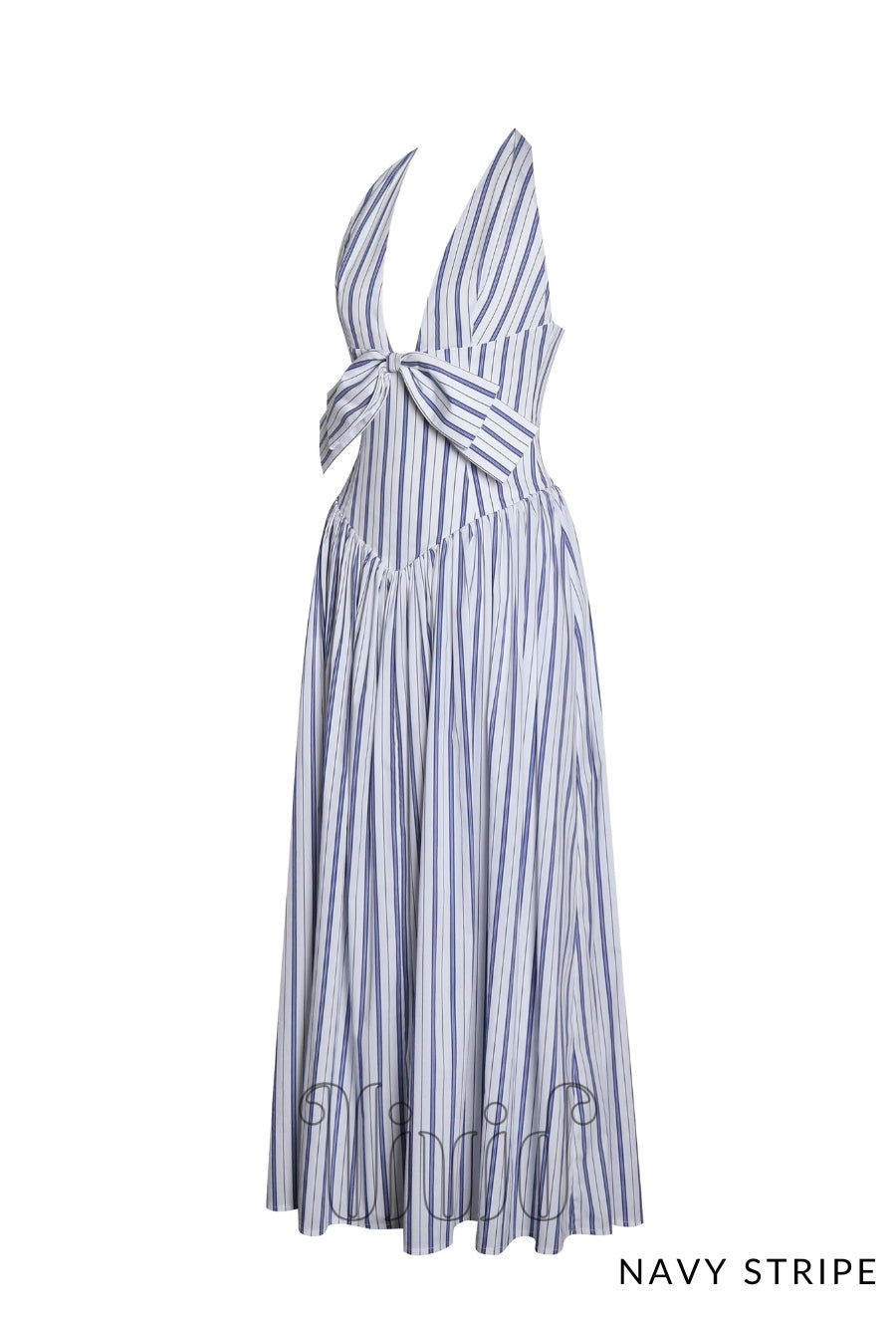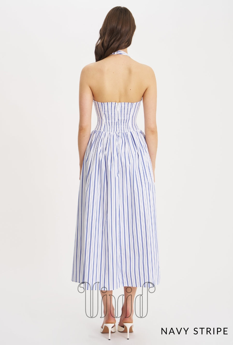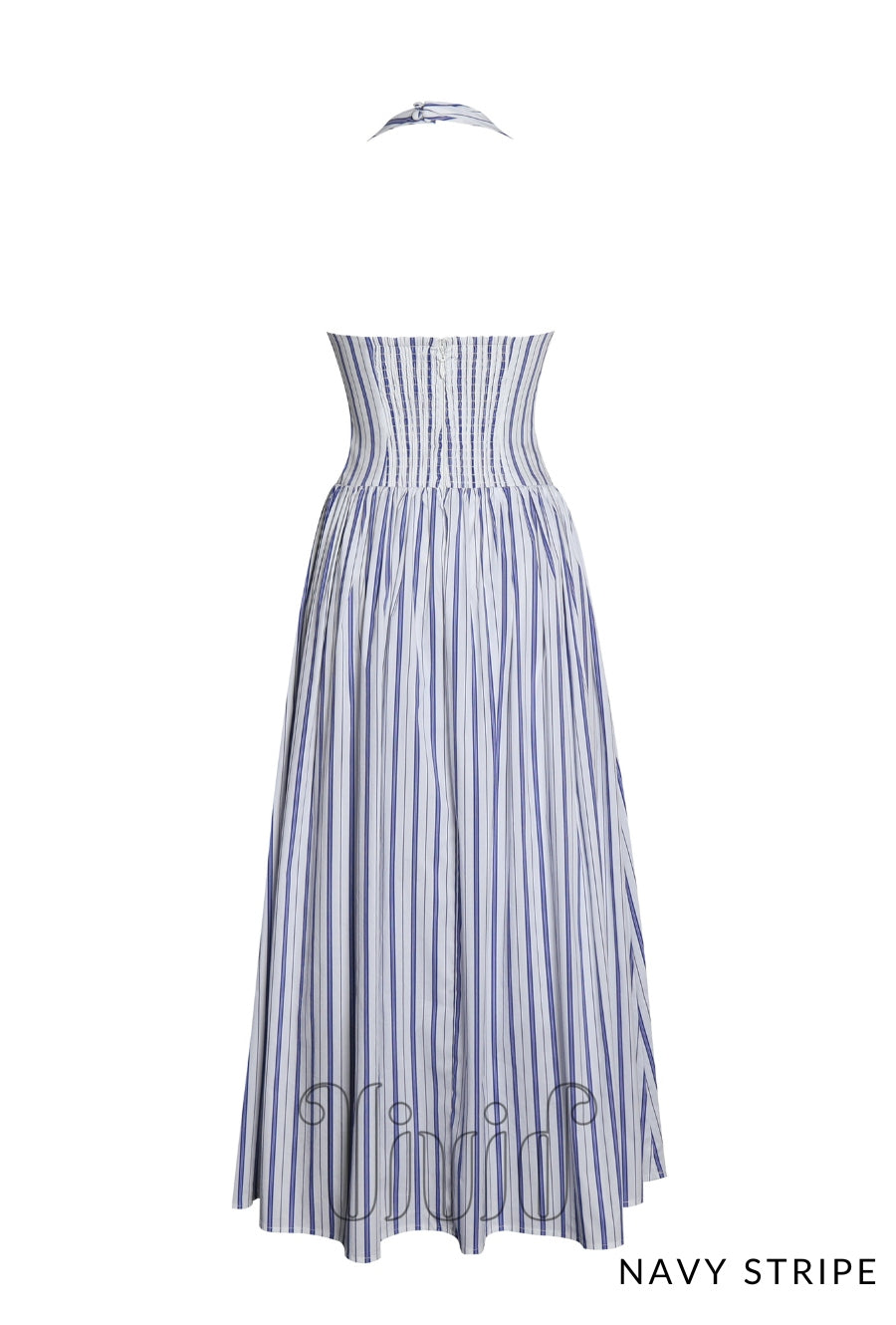 Breeze through your holiday in effortless elegance with the Nicky Dress. Designed in a classic navy beach-style stripe, this maxi dress channels relaxed vacation vibes with a polished twist. The halter neckline adds a touch of sophistication, while the smocked back and invisible zipper ensure a comfortable and flattering fit. A drop waist flows into a graceful silhouette, complete with invisible pockets for added functionality. Whether you're strolling along the coast or dining under the stars, the Nicky Dress is your go-to piece for vacation-ready style.